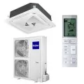 Кассетный кондиционер Haier ABH125K1E0 - модель для встраивания в подвесной потолок. Размеры внутреннего блока точно соответствуют ячейке подвесного потолка Армстронг. Поэтому такая модель предполагает скрытый монтаж - все оборудование прячется в потолок. На виду остается только декоративная решетка. Кстати, регулируемые жалюзи раздают прохладу сразу в 4 направлениях. Так как прохладный воздух опускается вниз плавным душем, комната охлаждается очень комфортно. Так что при охлаждении кассетной сплит-системой не возникает опасного для здоровья сквозняка.