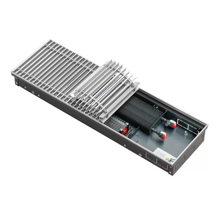 Для предотвращения коррозии все детали конвектора выполнен из высококачественной листовой оцинкованной стали с износостойким порошковым покрытием. Два типа профиля (U-образный и F-образный) декоративной рамки позволяют встраивать конвектор в любой тип пола.